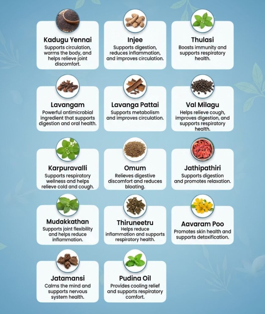 “It is mentioned in Siddha medical books that the herbs and oils included in the above mentioned Injee Karpooravalli oil are beneficial for hand pain, leg pain, joint pain, etc.”